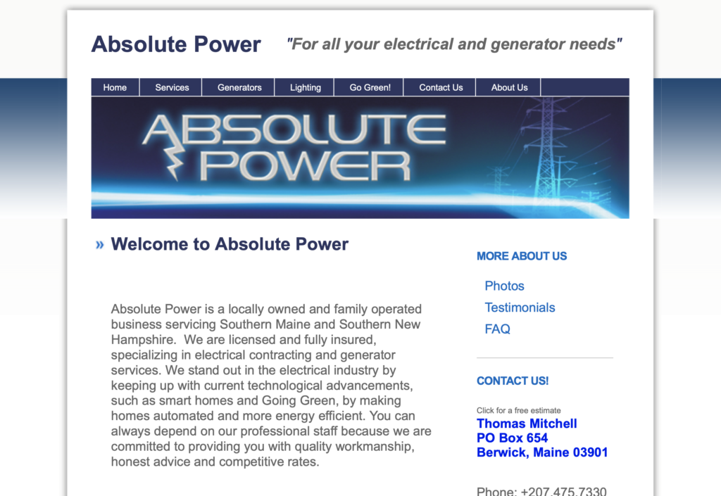 Absolute Power is a locally owned and family operated business servicing Southern Maine and Southern New Hampshire. We are licensed and fully insured, specializing in electrical contracting and generator services. We stand out in the electrical industry by keeping up with current technological advancements, such as smart homes and Going Green, by making homes automated and more energy efficient. You can always depend on our professional staff because we are committed to providing you with quality workmanship, honest advice and competitive rates.