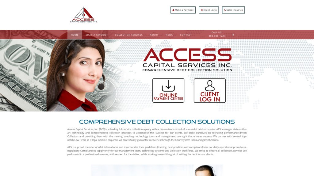 Access Capital Services (ACS) is a leading full-service collection agency with a proven track record of successful debt recoveries. ACS leverages state-of-the-art technology and comprehensive collection practices to accomplish this success for our clients. We pride ourselves on recruiting performance-driven Collectors and providing them with the training, coaching, technology tools and management oversight that ensures success. We partner with several top-notch Law Firms so if legal action is required, we can virtually guarantee recoveries through the Court system (liens and garnishments).