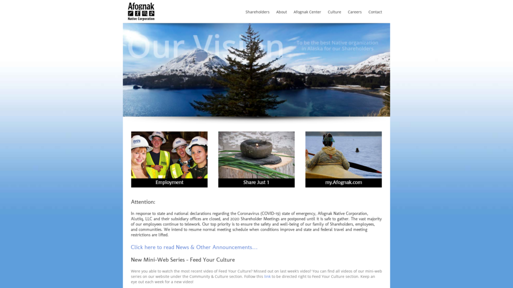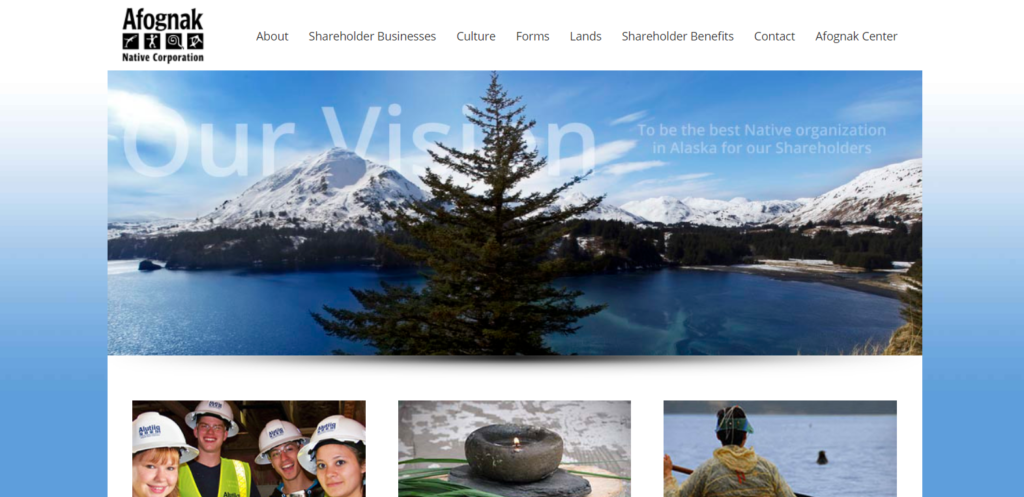 Afognak Purpose: Shareholders will have a perpetual source of land use, shared financial and cultural wealth to an extent justified by resources available. The Corporation will provide social, cultural, and economic benefits to Shareholders by building a sustainable, growing enterprise.