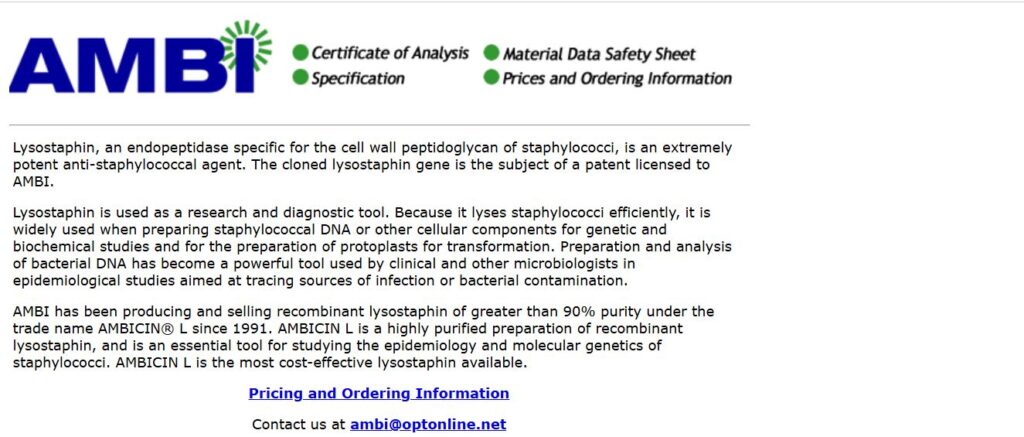 AMBI has been producing and selling recombinant lysostaphin of greater than 90% purity under the trade name AMBICINĀ® L since 1991. AMBICIN L is a highly purified preparation of recombinant lysostaphin, and is an essential tool for studying the epidemiology and molecular genetics of staphylococci. AMBICIN L is the most cost-effective lysostaphin available.