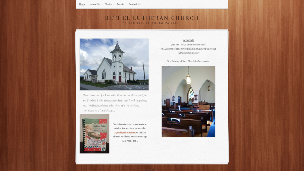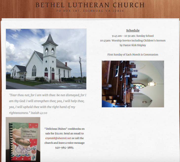 In 1884, Bethel became a member of the Mount Jackson Parish with St. James and Mount Calvary. In 1951 Bethel became a member of the Edinburg Parish with Zion and St. Jacobs. With the desire to be independent growing and the need for Bethel to have its own pastor, Bethel left the Edinburg Parish in 1992.