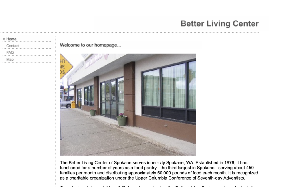 The Better Living Center of Spokane serves inner-city Spokane, WA. Established in 1976, it has functioned for a number of years as a food pantry – the third largest in Spokane – serving about 450 families per month and distributing approximately 50,000 pounds of food each month. It is recognized as a charitable organization under the Upper Columbia Conference of Seventh-day Adventists.
