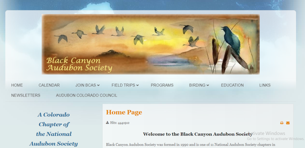 Black Canyon Audubon Society was formed in 1990 and is one of 11 National Audubon Society chapters in Colorado. The BCAS is committed to the conservation of natural resources through our birding, conservation, and educational activities. The region covered by the Black Canyon Audubon society encompasses nearly 8,300 square miles and includes Delta, Gunnison, Hinsdale, Montrose, San Miguel and Ouray counties. Within this region, elevations vary from 4,695 to 14,309 feet above sea level. Rainfall ranges from less than 8 inches per year in the lower valleys to more than 50 on the higher peaks. Vegetation varies from desert scrub to boreal forest and alpine tundra.