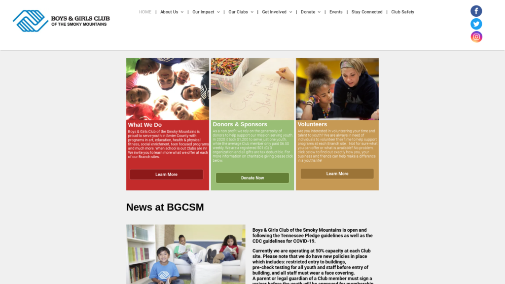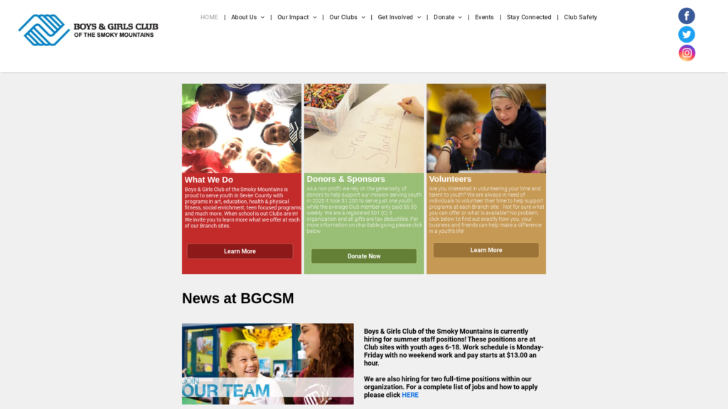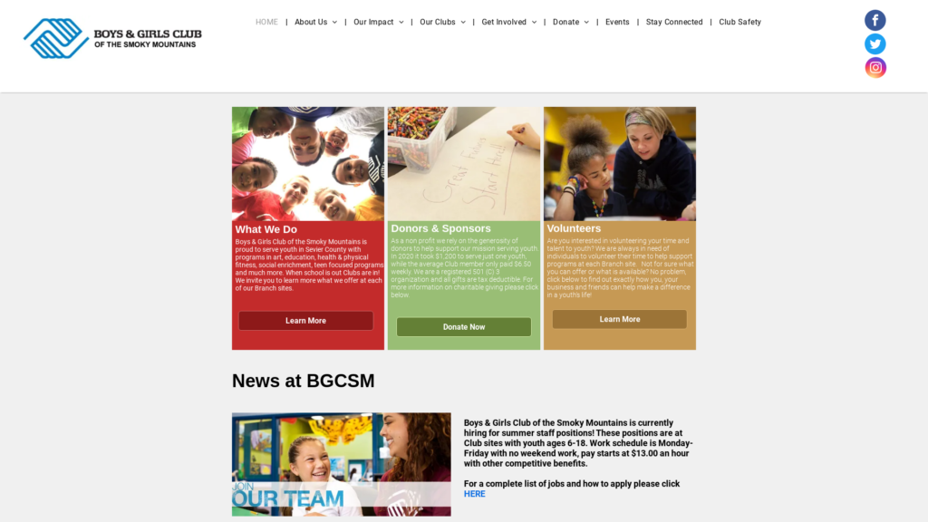 Boys & Girls Club of the Smoky Mountains is proud to serve youth in Sevier County with programs in art, education, health & physical fitness, social enrichment, teen focused programs and much more. When school is out Clubs are in! We invite you to learn more what we offer at each of our Branch sites.