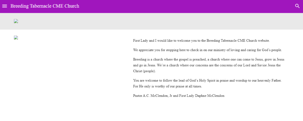 First Lady and I would like to welcome you to the Breeding Tabernacle CME Church website.