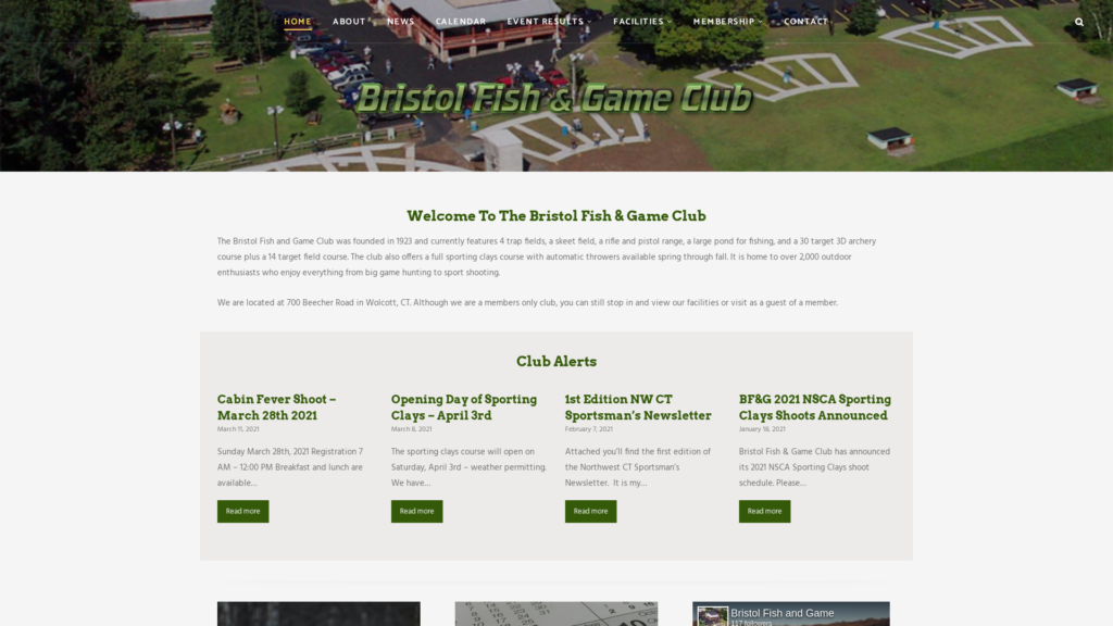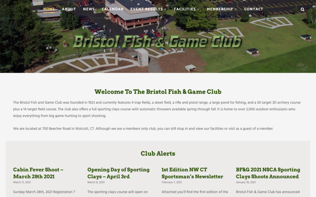 The Bristol Fish and Game Club were founded in 1923 and currently features 4 trap fields, a skeet field, a rifle and pistol range, a large pond for fishing, and a 30 target 3D archery course plus a 14 target field course. The club also offers a full sporting clay course with automatic throwers available spring through fall. It is home to over 2,000 outdoor enthusiasts who enjoy everything from big game hunting to sport shooting.