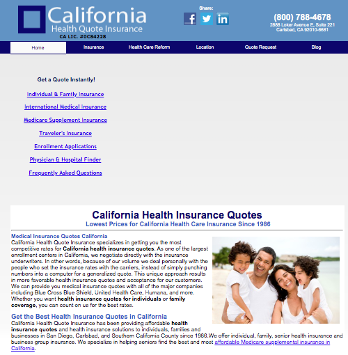 California Health Quote Insurance has been providing affordable health insurance quotes and health insurance solutions to individuals, families, and businesses in San Diego, Carlsbad, and Southern California County since 1986. We offer individual, family, senior health insurance, and business group insurance. We specialize in helping seniors find the best and most affordable Medicare supplemental insurance in California.