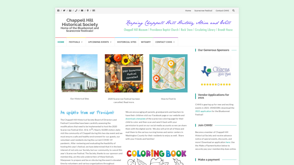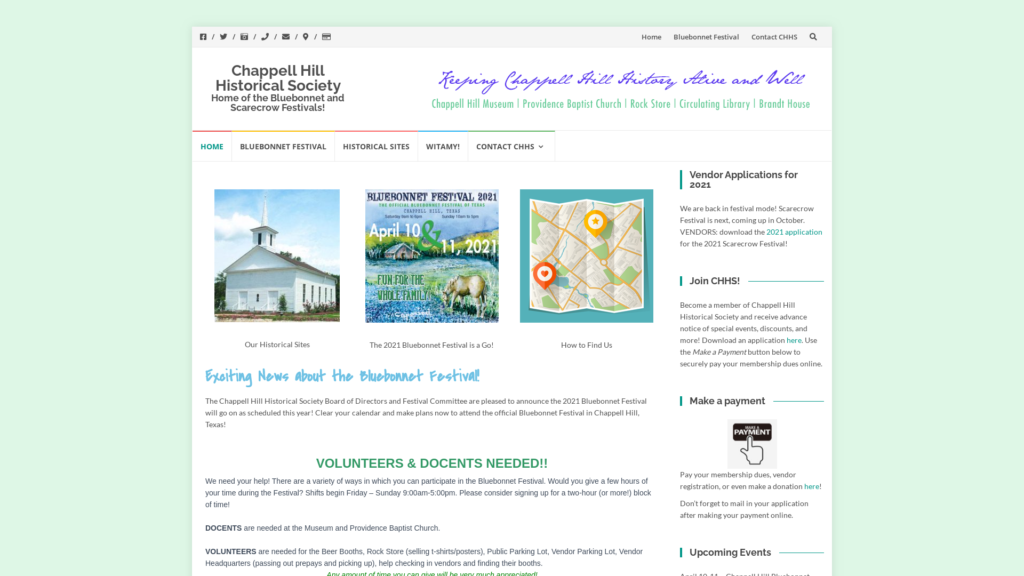 Chappell Hill Historical Society is home to the Official Bluebonnet Festival of Texas in the spring and the Scarecrow Festival every fall. Visit friendly Chappell Hill, Texas and tour our historic sites: Providence Baptist Church, the Chappell Hill Museum, the always-popular Rock Store, and more!