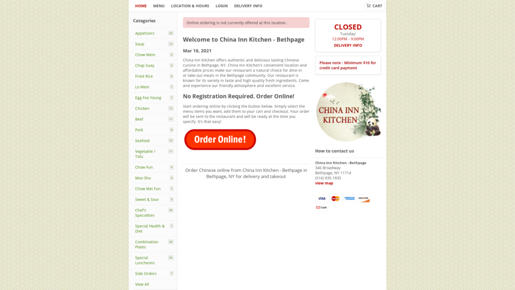 Order Chinese online from China Inn Kitchen - Bethpage in Bethpage, NY for delivery and takeout. Browse our menu and easily choose and modify your selection.