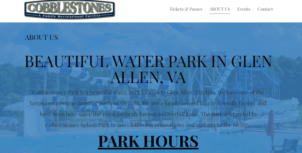 Cobblestones Park is a beautiful water park located in Glen Allen, Virginia. We have one of the largest concrete swimming pools in Virginia. We are a locally owned family-friendly facility and have been here since the 1950s formerly known as Overhill Lake. The park rebranded to Cobblestones Splash Park in 2005 following renovations and updates to the facility.