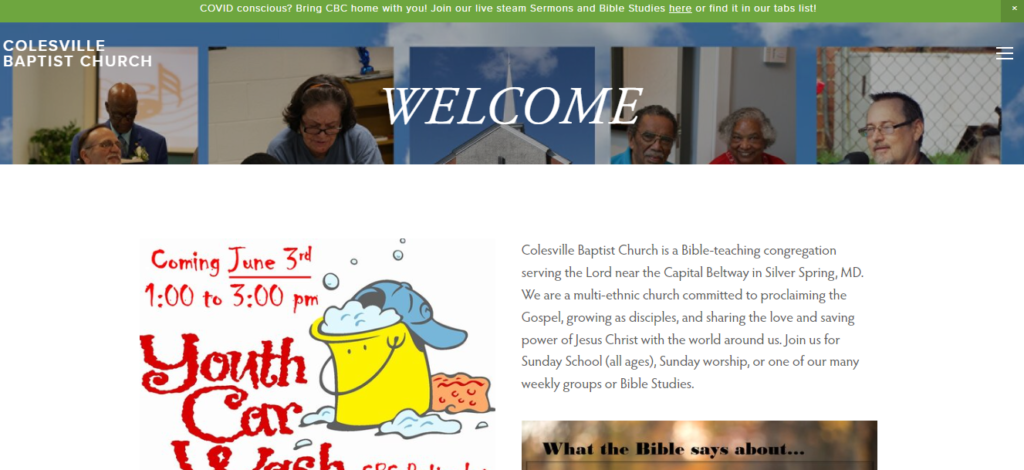 Colesville Baptist Church is a Bible-teaching congregation serving the Lord near the Capital Beltway in Silver Spring, MD. We are a multi-ethnic church committed to proclaiming the Gospel, growing as disciples, and sharing the love and saving power of Jesus Christ with the world around us. Join us for Sunday School (all ages), Sunday worship, or one of our many weekly groups or Bible Studies.