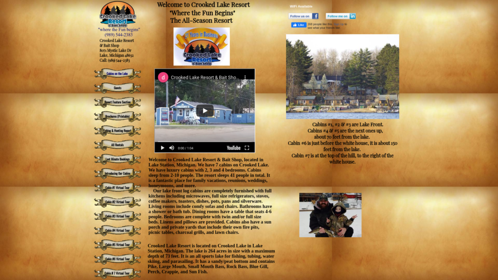 Crooked Lake Resort is located on Crooked Lake in Lake Station, Michigan. The lake is 264 acres in size with a maximum depth of 73 feet. It is an all sports lake for fishing, tubing, water skiing, and parasailing. It has a sandy/peat bottom and contains Pike, Large Mouth, Small Mouth Bass, Rock Bass, Blue Gill, Perch, Crappie, and Sun Fish.