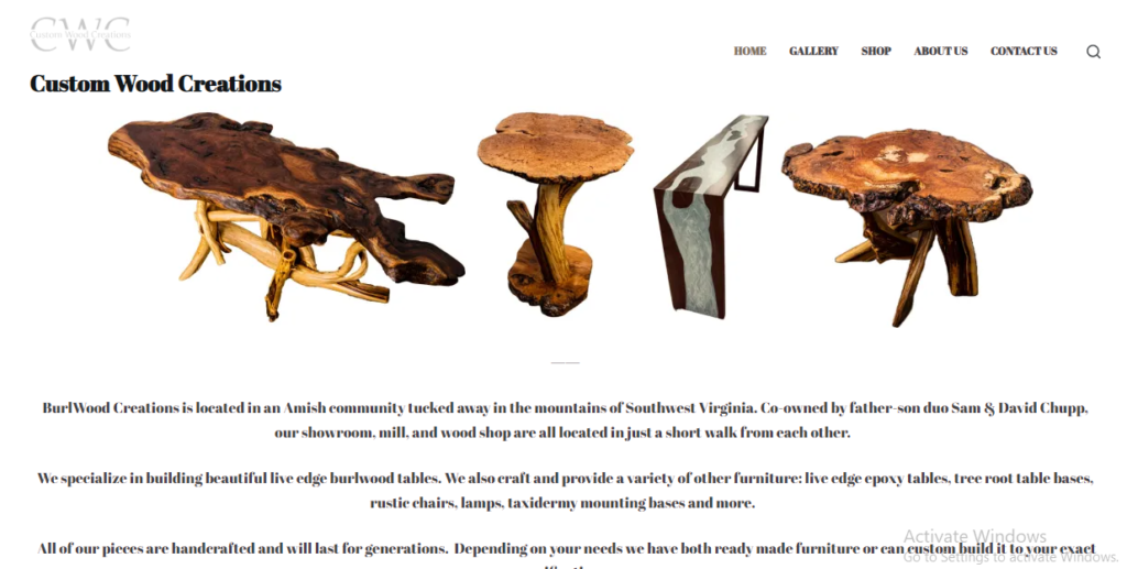 We specialize in building beautiful live edge burlwood tables. We also craft and provide a variety of other furniture: live edge epoxy tables, tree root table bases, rustic chairs, lamps, taxidermy mounting bases and more.