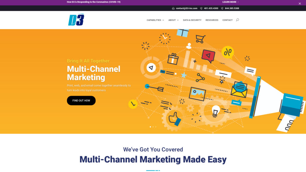 D3 is a marketing services group of knowledgeable professionals well-versed in data management, digital printing, variable data, e-marketing, mailing services, offset printing, fulfillment and much more. We are a trusted solution partner committed to delivering the right message, to the right audience, at the right time.