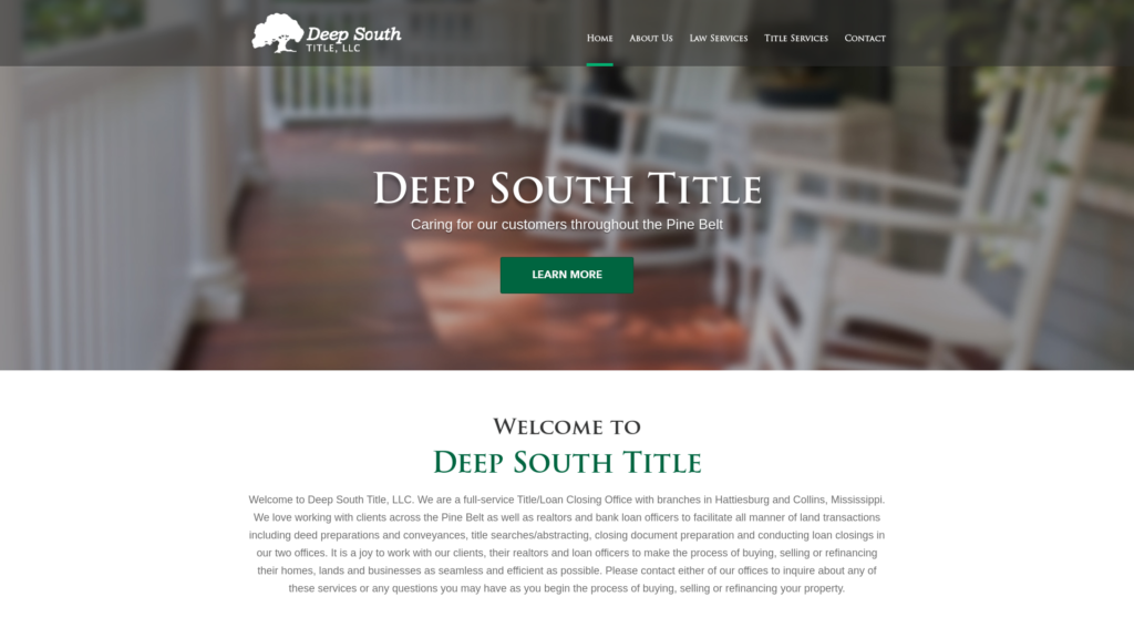 Welcome to Deep South Title, LLC. We are a full-service Title/Loan Closing Office with branches in Hattiesburg and Collins, Mississippi. We love working with clients across the Pine Belt as well as realtors and bank loan officers to facilitate all manner of land transactions including deed preparations and conveyances, title searches/abstracting, closing document preparation and conducting loan closings in our two offices. It is a joy to work with our clients, their realtors and loan officers to make the process of buying, selling or refinancing their homes, lands and businesses as seamless and efficient as possible. Please contact either of our offices to inquire about any of these services or any questions you may have as you begin the process of buying, selling or refinancing your property.