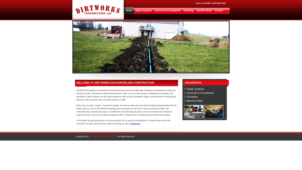 Dirt Works Excavating & Construction of the Kansas City area has provided safe, thorough excavating and construction services for years. We have the skills and know-how to make sure your home project is satisfactorily completed. We specialize in septic systems, but also have experience with concrete, foundation repairs, machine work for moving large amounts of dirt, and even have a licensed plumber on staff.