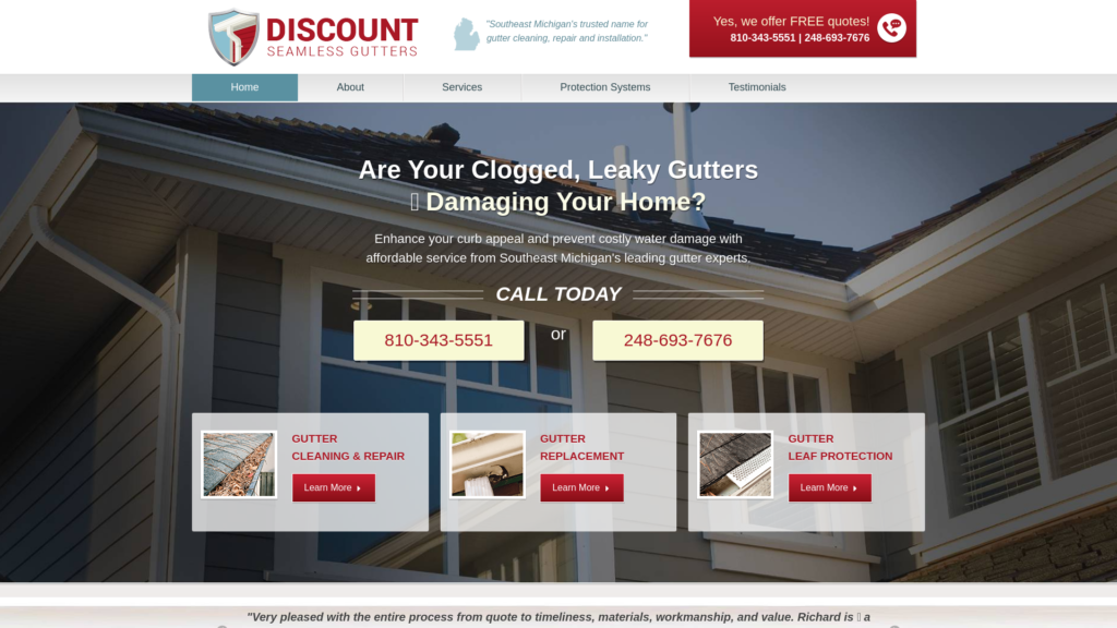 We offer professional gutter cleaning, gutter repair, gutter installation, and gutter protection system installation throughout Southeast Michigan. Our personal service, affordable prices, and comprehensive selection of colors and styles make us the smart choice for all your gutter needs. Don’t let your damaged or clogged gutters put your home at risk for water damage. Contact the experts at Discount Seamless Gutters today!