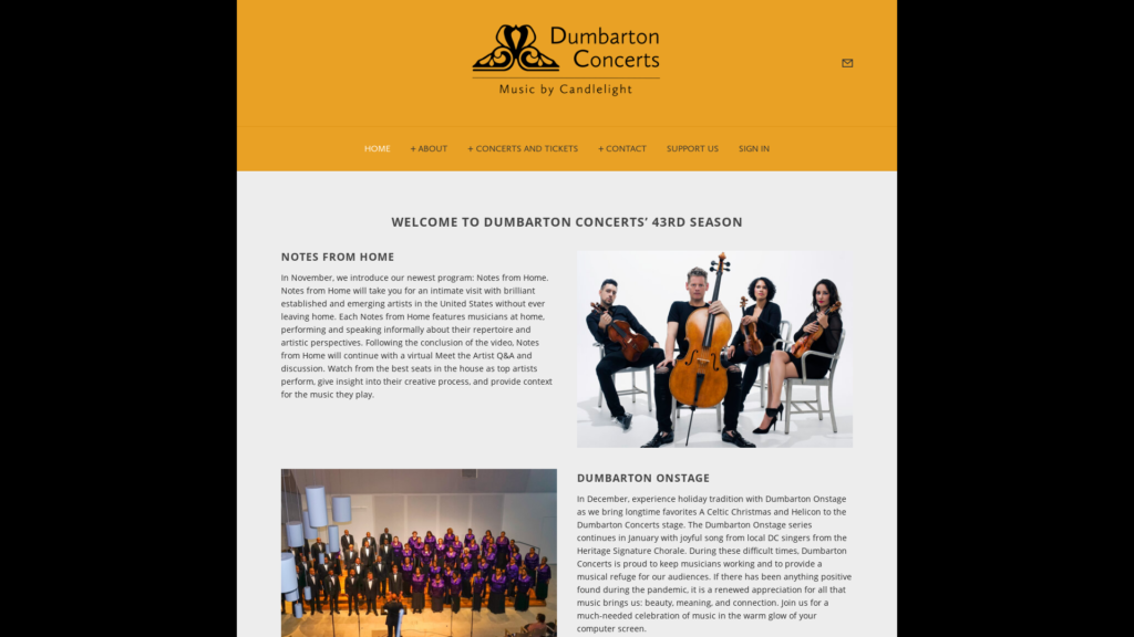 Dumbarton Concerts has presented chamber and jazz music in the heart of Georgetown since 1978, always striving to bring a fresh perspective to Washington, DC’s chamber music scene. Our 42nd season is now available, offering our most ambitious and varied series of concerts yet. Our mission to present young, diverse, local, and unforgettable artists continues, and we hope you will buy your tickets now and come along!