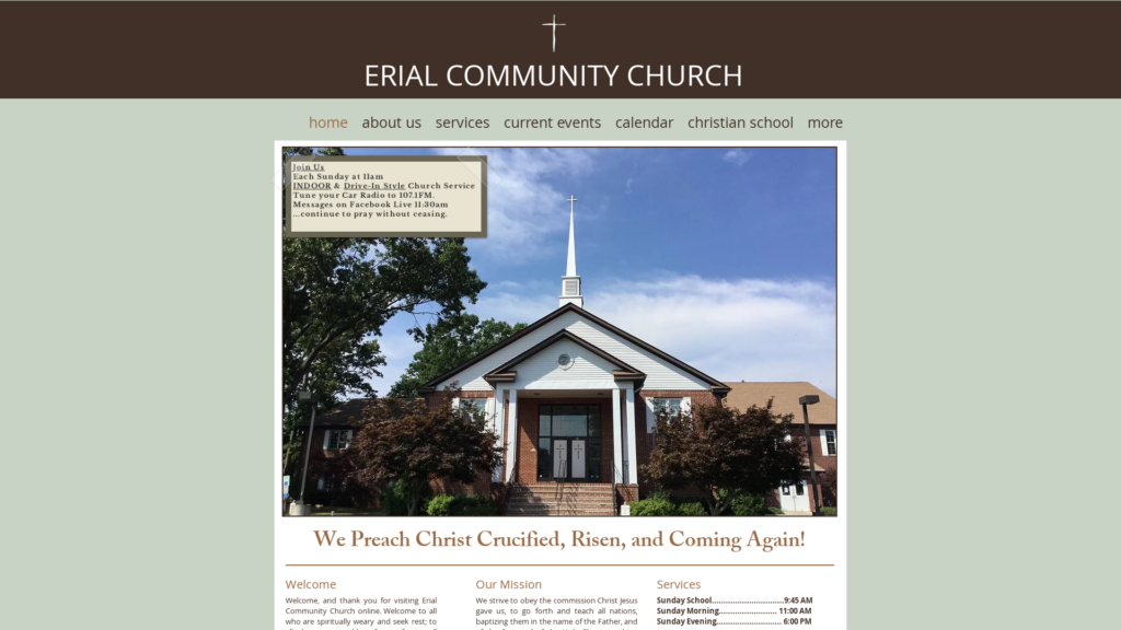 Erial Community Church is a non-denominational, Bible believing, Christian church who serves the South Jersey area. W preach Christ crucified, risen, and coming again.