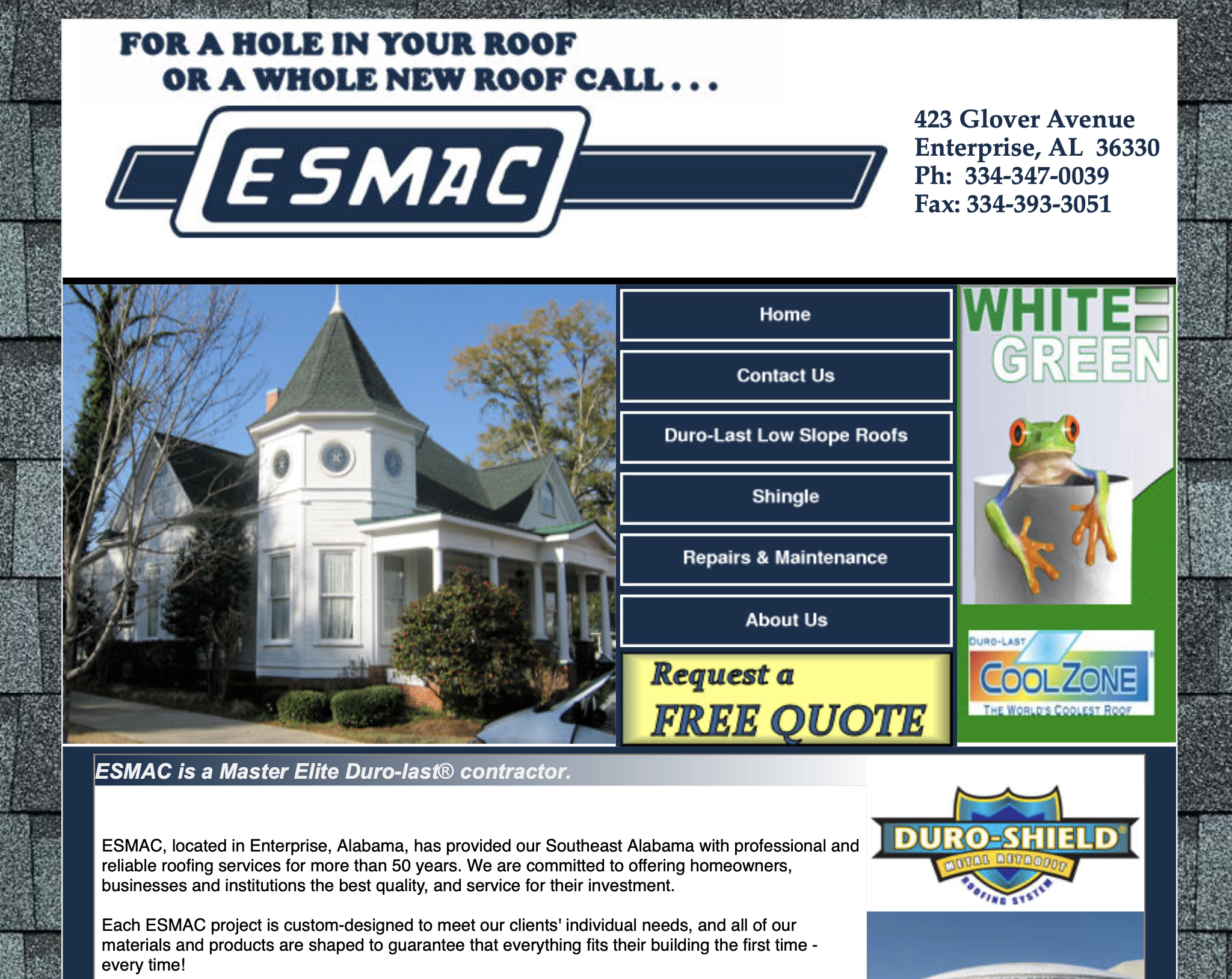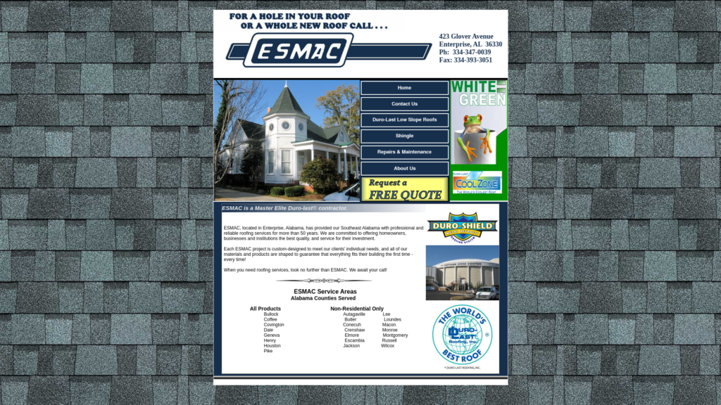 Roofer, roofing, shingles, enterprise, southeast, Ozark, Andalusia, Dothan, Geneva, Elba, roof leaks, durolast, roofing repairs, local roofer, certified roofing contractor, esmac, commercial roofing, free estimates