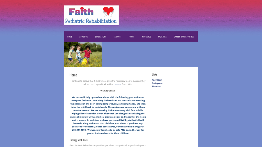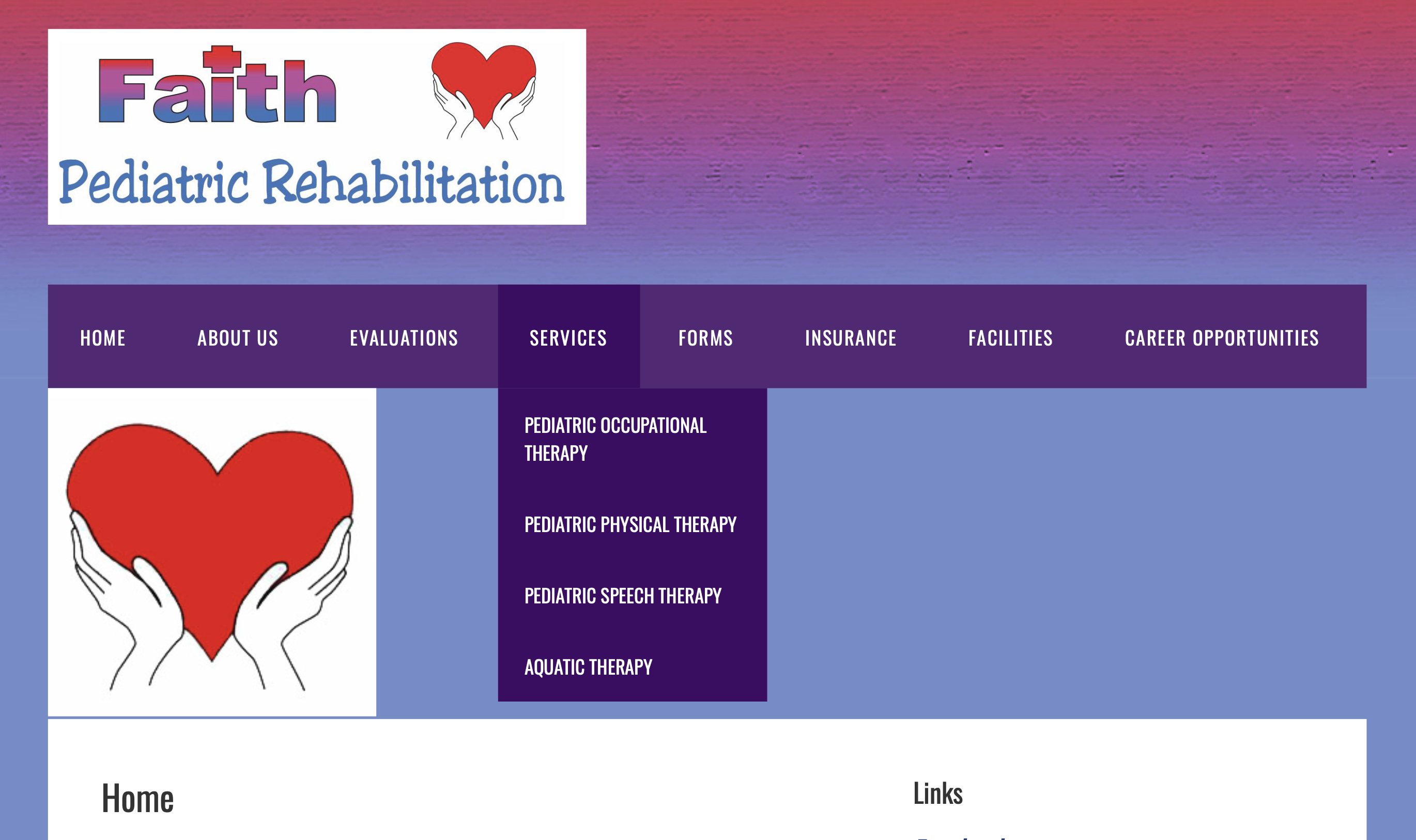 Faith Pediatric Rehabilitation is a private pediatric clinic offering Occupational Therapy, Speech Therapy, Physical Therapy and Aquatic Therapy. In addition to private therapy offices, our facility is equipped with a fully stocked kitchen used for language therapy and feeding intervention, three sensory gyms containing ball pits, a rock climbing wall, swings and other climbing equipment as well as a heated therapeutic pool used during Aqua therapy.