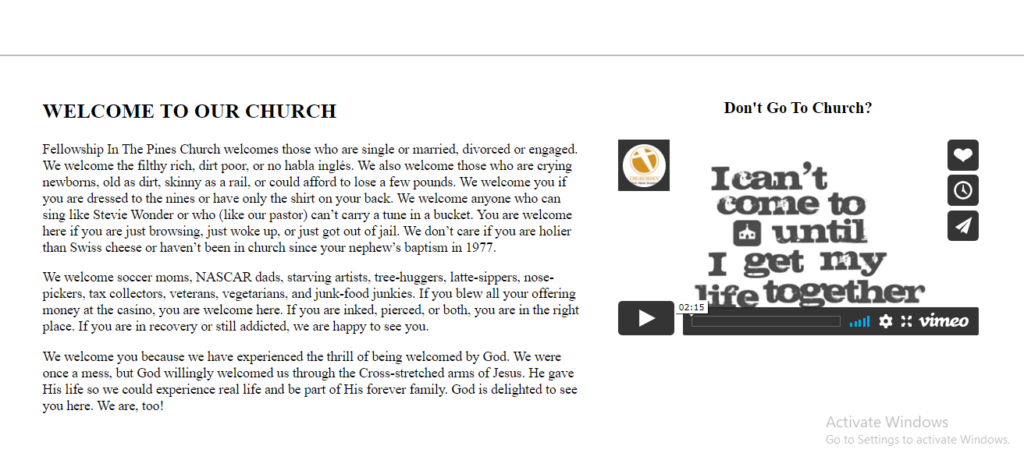 Fellowship In The Pines Church welcomes those who are single or married, divorced or engaged. We welcome the filthy rich, dirt poor, or no habla inglés. We also welcome those who are crying newborns, old as dirt, skinny as a rail, or could afford to lose a few pounds. We welcome you if you are dressed to the nines or have only the shirt on your back. We welcome anyone who can sing like Stevie Wonder or who (like our pastor) can’t carry a tune in a bucket. You are welcome here if you are just browsing, just woke up, or just got out of jail. We don’t care if you are holier than Swiss cheese or haven’t been in church since your nephew’s baptism in 1977.