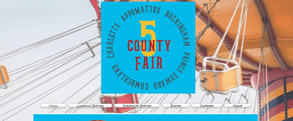 Come to the Five County Fair! Traditional Fair Serving the Five Counties of Appomattox, Buckingham, Charlotte, Cumberland, and Prince Edward. We have Games, Carnival Rides, Exhibits, Food, Beauty Pageants, Professional Wrestling, Livestock Shows, Petting Zoo, Team Zoom Canine Entertainment, Power Wheels Derby and Pie Eating Contest.