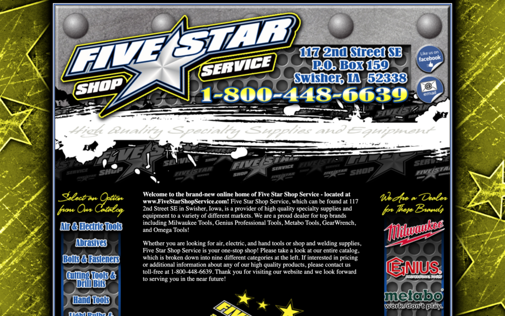 Five Star Shop Service, which can be found at 117 2nd Street SE in Swisher, Iowa, is a provider of high-quality specialty supplies and equipment to a variety of different markets. We are a proud dealer for top brands including Milwaukee Tools, Genius Professional Tools, Metabo Tools, GearWrench, and Omega Tools!