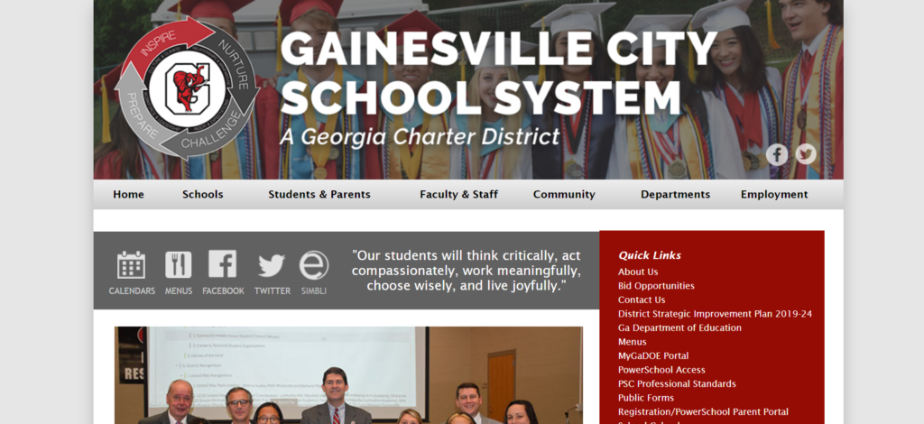 The Gainesville City School System is a Georgia Charter School System serving approximately 8,000 students from Pre-K through Grade 12 in eight specialty charter programs open to parental student choice. Our schools represent a wide range of diverse backgrounds which adds to the richness and quality of their educational experience. The district has a strong legacy of outstanding achievement in academics, arts, and athletics. Various educational resources and services are provided for students to be academically successful and to be prepared for college and career pathways upon graduation.