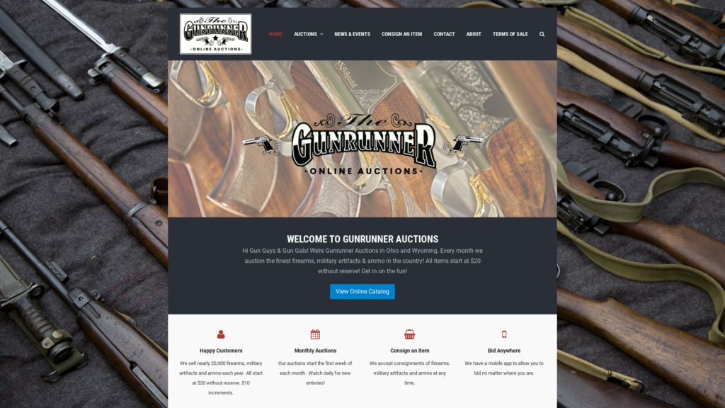 The Gunrunner Online Firearm Auctions were created in 1999 first as a live auction company/gun store and then exclusively online in 2005. We sell nearly 20,000 firearms each year from Revolutionary War to Civil War to Indian War to World War I and II to modern carry handguns, investment/collectible Colts, Smith & Wesson and Winchester levers! If it goes “bang!” we’ve sold it! From Gatling Guns to tiny derringers, we offer firearms from all 50 states. We’ve sold the personal firearms of Elvis Presley, Steve McQueen, Magnum P.I., Herb Parsons, Alex McCord and others! ALL of of firearms start at $20 without reserve – that’s the secret of our success. We have two auction facilities – one in Burton, Ohio and one in Cody, Wyoming. We’re the FUN company!