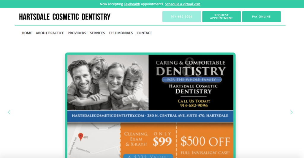 Their fees are based on the quality of the materials used and the experience in performing your needed treatment. To facilitate this goal, Hartsdale Cosmetic Dentistry accepts the following payment options: major credit cards, such as Visa, MasterCard, American Express, and Discover, are accepted by the practice. They also offer financing through CareCredit. For more information or to apply online, please click on their logo.