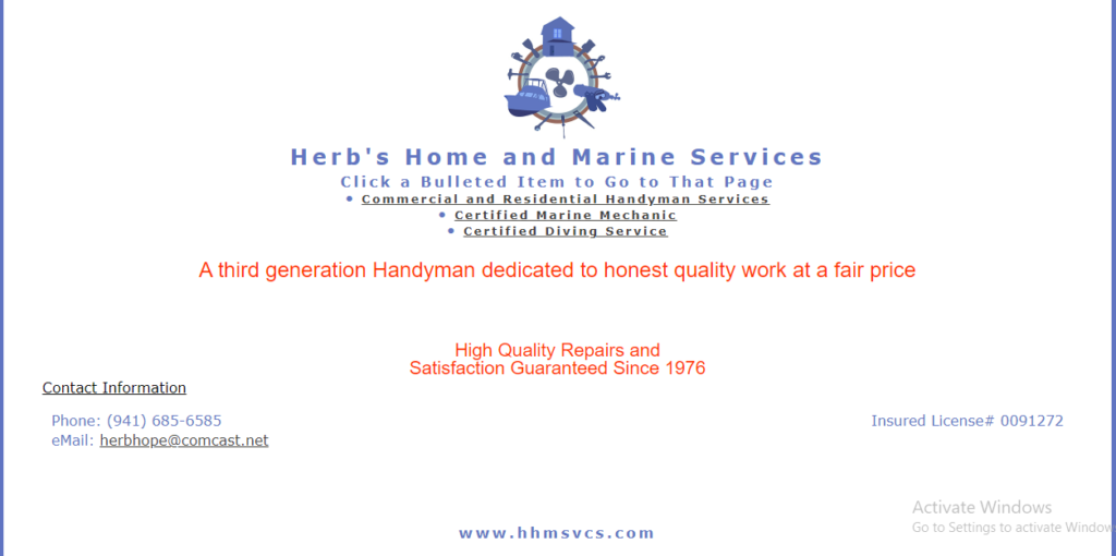 Home » Listings » Herb’s Home & Marine Services May 15, 2023 Herb's Home & Marine Services Marine A third generation Handyman dedicated to honest quality work at a fair price Add to favourites Report abuse Contact details Please complete the captcha field below to view phone number and/or email address. http://hhmsvcs.com WHOIS Created on: 06/11/2019, 15:20PM Last Updated on: 06/12/2025, 08:01AM Expires on: 06/11/2026, 15:20PM Registrant: Organization: Domains By Proxy, LLC State: Arizona Country: UNITED STATES Country Code: US Technical Contact: Organization: Domains By Proxy, LLC State: Arizona Country: UNITED STATES Country Code: US Domain Name: hhmsvcs.com Name Servers: Host Names: NS67.DOMAINCONTROL.COM, NS68.DOMAINCONTROL.COM Audit: Created on: 04/26/2026, 19:27PM Last Updated on: 04/26/2026, 19:27PM Registrar: GoDaddy.com, LLC Registrar IANAID: 146 WHOIS Server: whois.godaddy.com Contact Email: abuse@godaddy.com