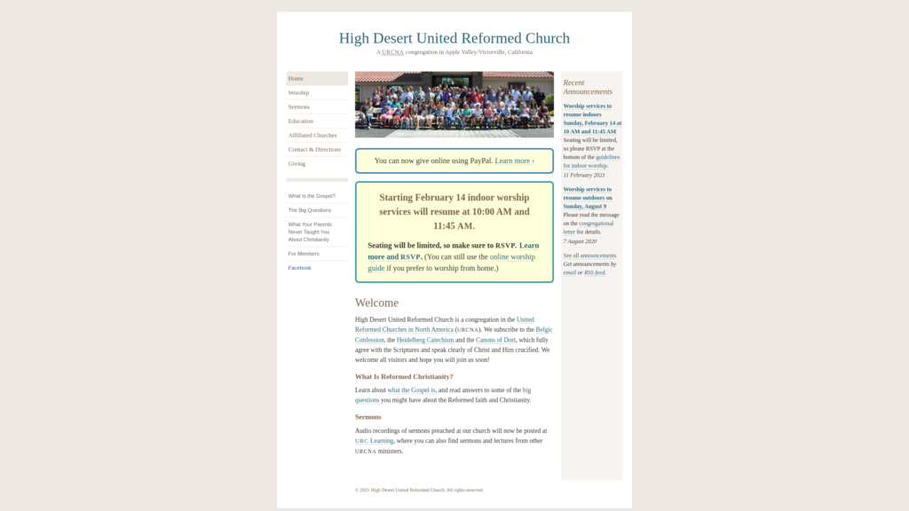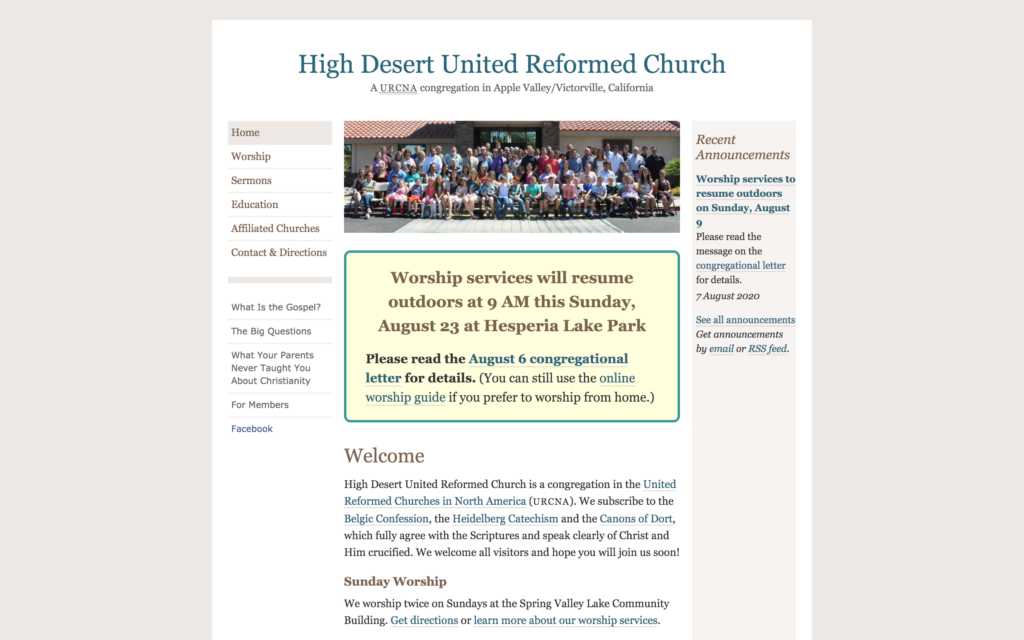 High Desert United Reformed Church North America Apple Valley Victorville Southern California Bible Biblical confession confessional liturgy liturgical Christian Calvinism Continental Reformed Word sacraments Gospel Law Three Forms Heidelberg Catechism Belgic Confession Canons of Dort sermons redemptive historical