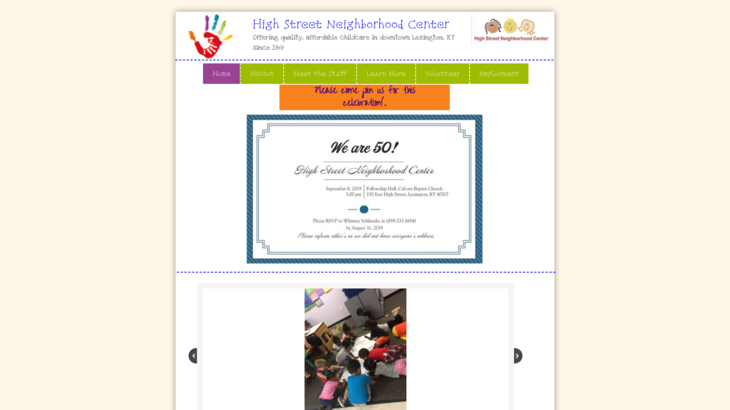 High Street Neighborhood Center is a co-operated day care facility which has been in operation since November 3, 1969. Sponsored by Calvary Baptist and First United Methodist Churches, HSNC has been dedicated to serving low income families for more than two decades.