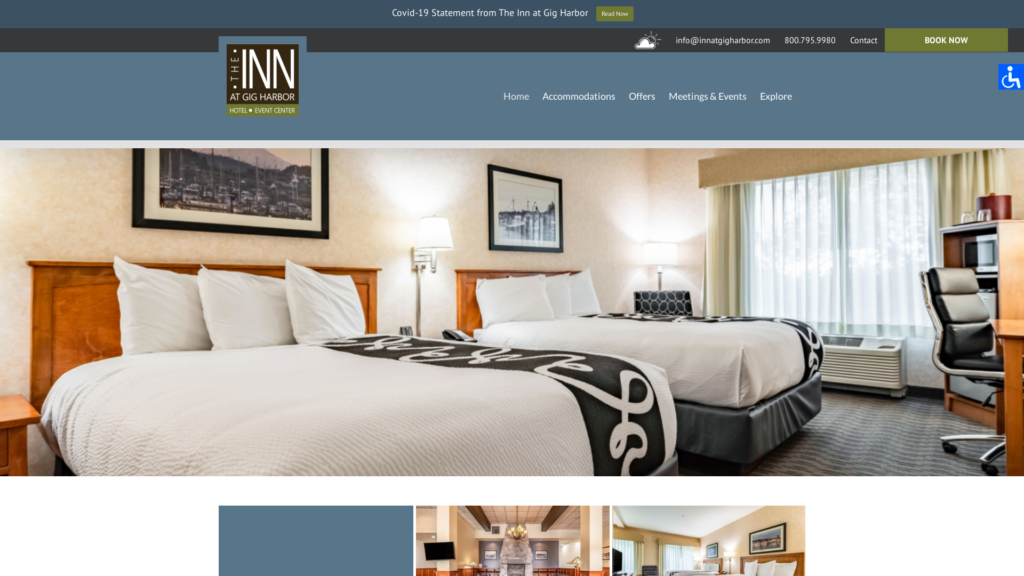 The Inn at Gig Harbor brings a cozy and relaxing ambiance and outstanding service combined with the adventurous style of the Pacific Northwest. The Inn’s premiere location positions you just 10 minutes from waterfront dining, harbor activities and the Gateway to the Olympic Peninsula. This quaint, mile long harbor town blends water, arts, nature, history, food and spirits in a way that will make you never want to leave.