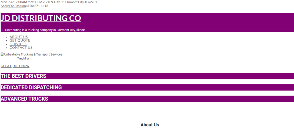 Home » Listings » JD DISTRIBUTING April 6, 2024 JD DISTRIBUTING Transport JD Distributing is a trucking company in Fairmont City, Illinois. Add to favourites Report abuse Contact details Please complete the captcha field below to view phone number and/or email address. http://jddistributing.net WHOIS Created on: 12/15/2017, 17:59PM Last Updated on: 11/30/2025, 18:36PM Expires on: 12/15/2026, 17:59PM Registrant: Organization: JD Distributing State: IL Country: UNITED STATES Country Code: US Domain Name: jddistributing.net Name Servers: Host Names: ns-cloud-b3.googledomains.com, ns-cloud-b1.googledomains.com, ns-cloud-b4.googledomains.com, ns-cloud-b2.googledomains.com Audit: Created on: 04/17/2026, 03:49AM Last Updated on: 04/17/2026, 03:49AM Registrar: Squarespace Domains II LLC Registrar IANAID: 895 WHOIS Server: whois.squarespace.domains Contact Email: abuse-complaints@squarespace.com