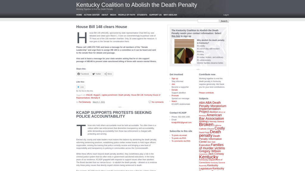 KCADP educates members of the Kentucky Legislature about why the death penalty is costly; out of step with modern thinking; risky; unfair, broken, and arbitrary; and unnecessary; and that victims’ families deserve more care and compassion.