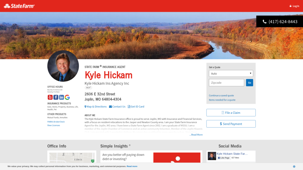 Call (417) 624-8443 for life, home, car insurance and more. Get a free quote from State Farm Agent Kyle Hickam in Joplin, MO