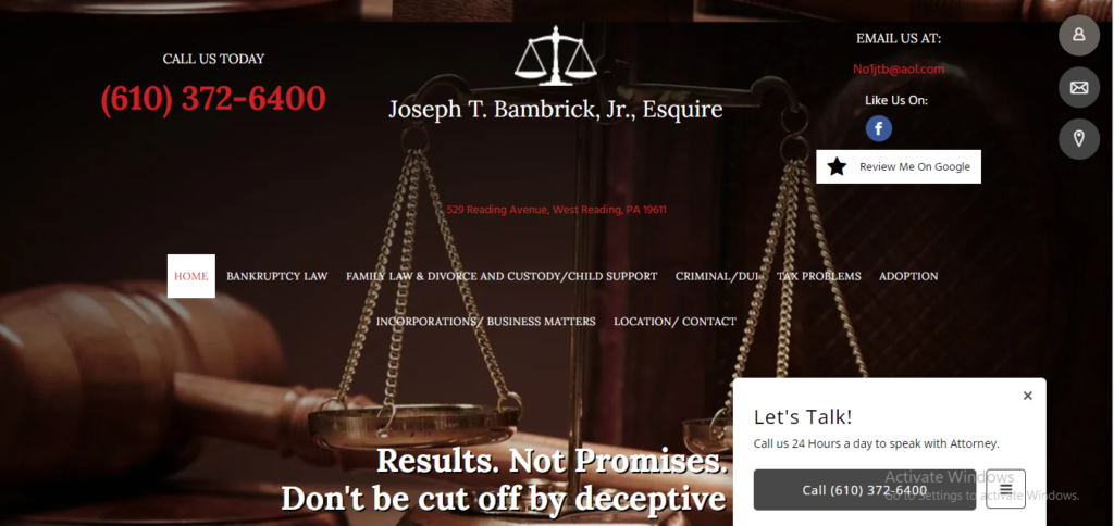 For over 35 years, our name has been synonymous with high-quality legal services throughout the Berks County, Pennsylvania area. We pride ourselves on our reputation within the community as an experienced and dedicated law firm, giving you proven results. With a convenient location, our firm is centrally situated to serve your legal needs. From our attorney to our administrative staff, Joseph T. Bambrick, Jr., Esquire has a knowledgeable team of professionals that you can rely on for any legal issue. It is as important to us as it is to you that we provide clarity in our advice and transparency throughout our internal processes. We dedicate a great deal of time to understanding your case at a personal level and thoroughly evaluate your specific requirements before proposing a solution. Trust the attorneys at Joseph T. Bambrick, Jr., Esquire in Berks County, Pennsylvania, when you want legal services catered to your individual needs. We offer aggressive legal assistance to obtain effective and efficient results. Our attorneys provide comprehensive legal services with a personalized approach.