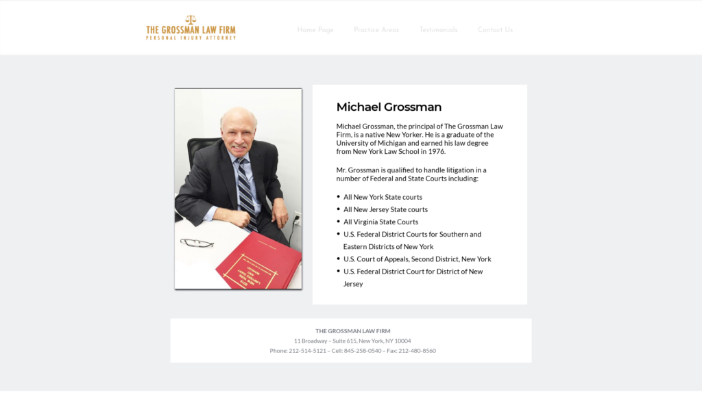 Michael Grossman, the principal of The Grossman Law Firm, is a native New Yorker. He is a graduate of the University of Michigan and earned his law degree from New York Law School in 1976.
