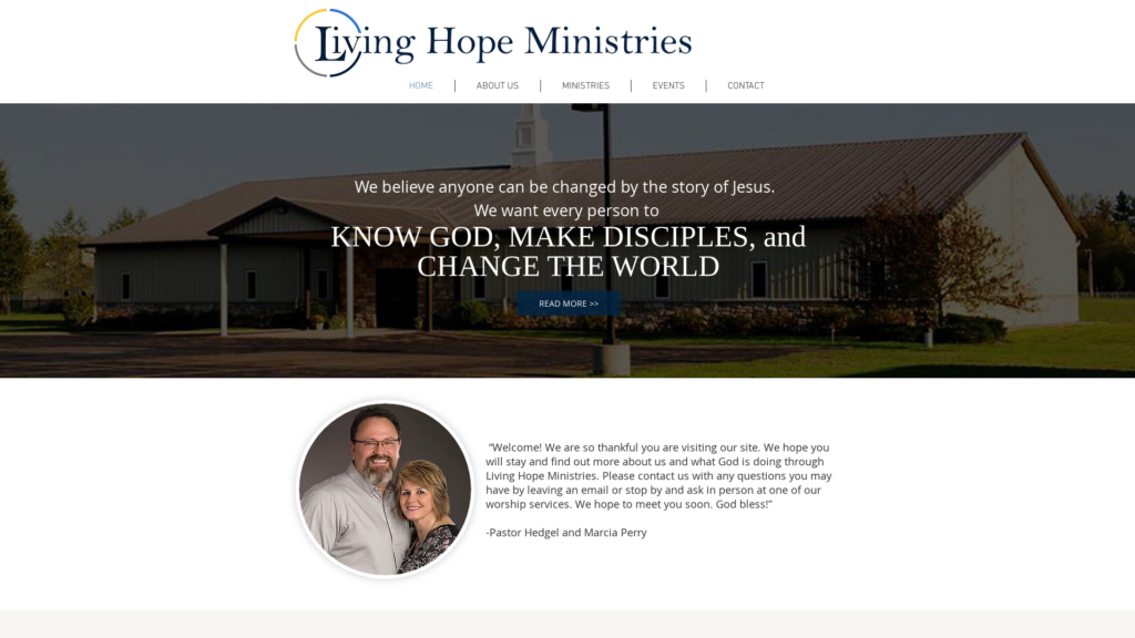 Welcome! We are so thankful you are visiting our site. We hope you will stay and find out more about us and what God is doing through Living Hope Ministries. Please contact us with any questions you may have by leaving an email or stop by and ask in person at one of our worship services. We hope to meet you soon. God bless!”