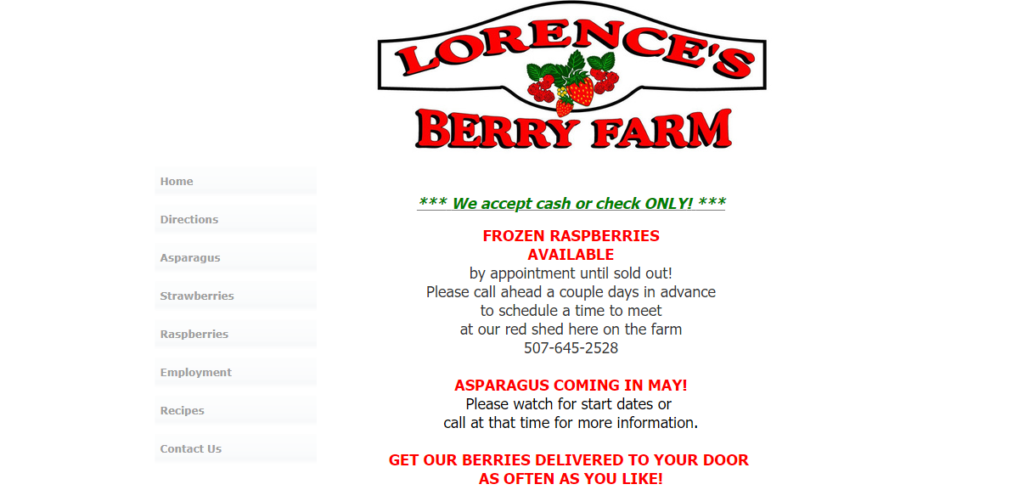We sell pre-picked asparagus, strawberries, and raspberries. We also offer pick your own strawberries and raspberries. Call us for more information.