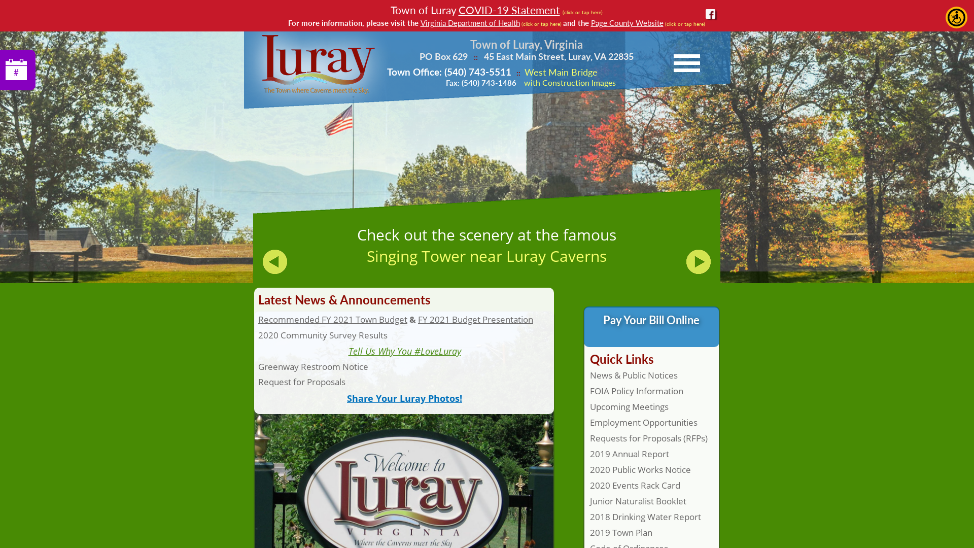 Town of Luray municiple offices: Luray is situated in the beautiful, historical Shenandoah Valley in Virginia. Learn about town services, Luray Parks & Recreation, download forms and more through our Town of Luray, VA website.
