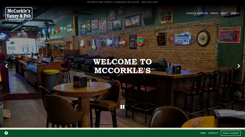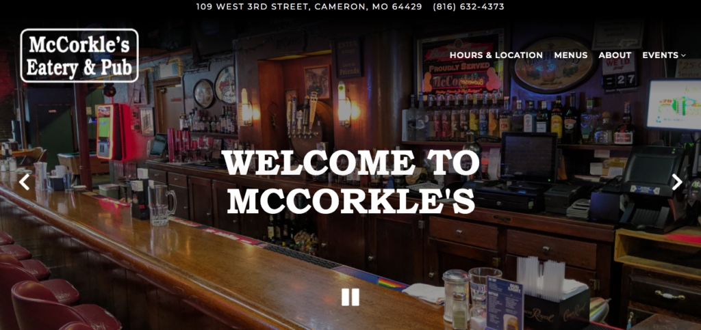 Come on down to Olde Towne Cameron, Missouri and try out McCorkle's. We have a huge variety of food, and a full bar to go with it. We have been doing our best to please our customers since 1997. McCorkle's has a great atmosphere, pool tables in the back, a dart board, and we are now proud to say we are fully non-smoking!