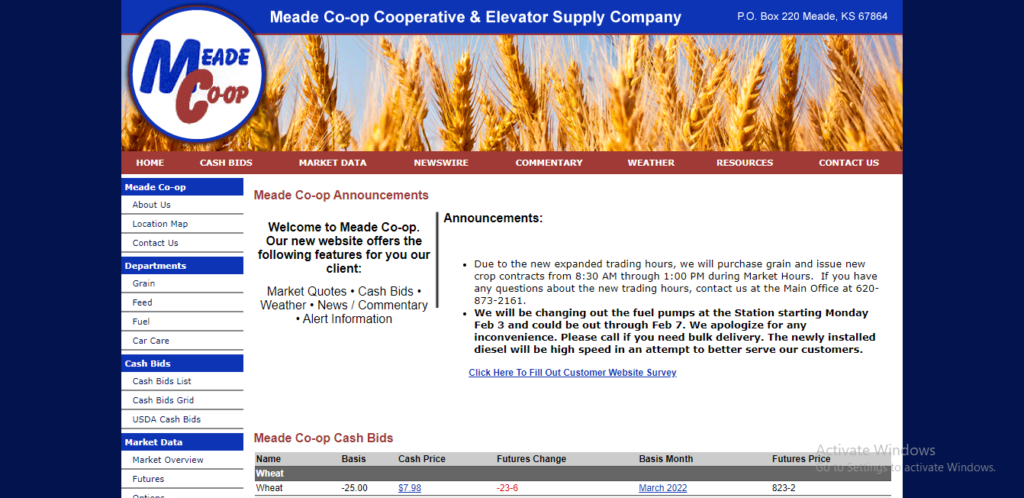 The Cooperative Elevator and Supply Co. was chartered in 1913. We have three locations, Meade, Missler and Englewood Kansas. Our total grain storage capacity is 2,871,000 bushels. We offer NH3 fertilizer, as well as dry and liquid fertilizer for our customers needs. We have a Feedmill at our Meade location that can supply custom feed mixes as well as delivery. Meade has a card operated fueling station and our car care facility offers just about everything your car needs.