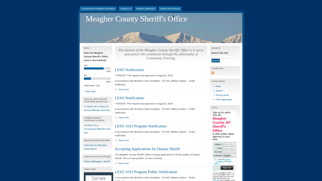 The mission of the Meagher County Sheriffs Office is to serve and protect the community through the philosophy of Community Policing.