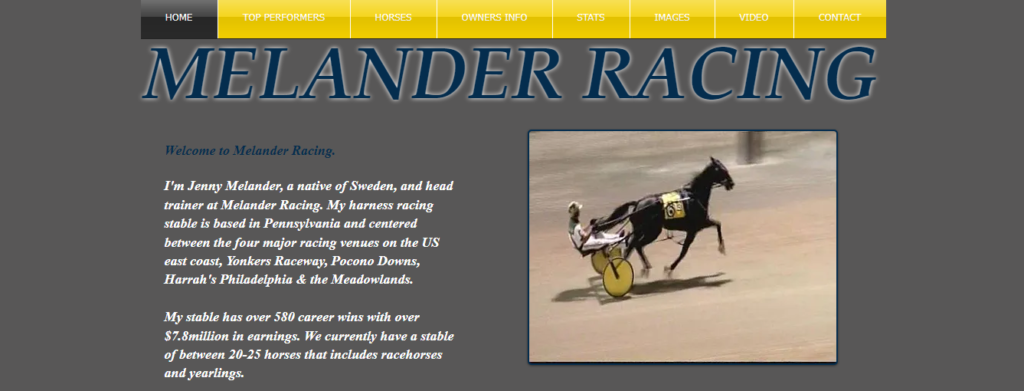 I’m Jenny Melander, a native of Sweden, and head trainer at Melander Racing. My harness racing stable is based in Pennsylvania and centered between the four major racing venues on the US east coast, Yonkers Raceway, Pocono Downs, Harrah’s Philadelphia & the Meadowlands.