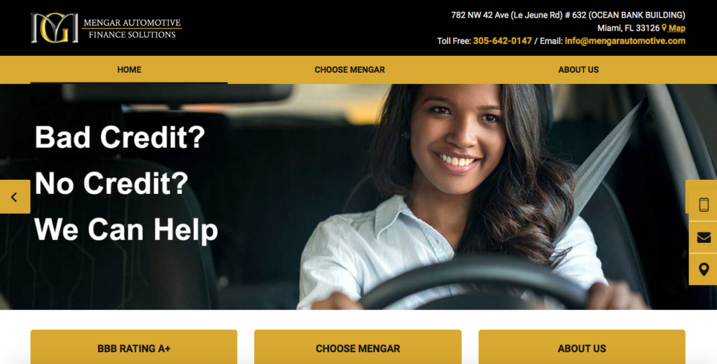 “Mengar Auto-Finance was founded during the economic meltdown of 2008 when society suffered the most serious financial crisis since the Great Depression. All banks were considered risky, while at the same time consumer & business confidence collapsed. Mengar Auto-Finance founders used their 50 years of combined experience to develop a company composed of moral standards. We believe that if you treat people right, those people will remain, loyal customers, plus recommend others to the service. Find out why Mengar Auto-Finance is “The Solution” for all your automotive needs.