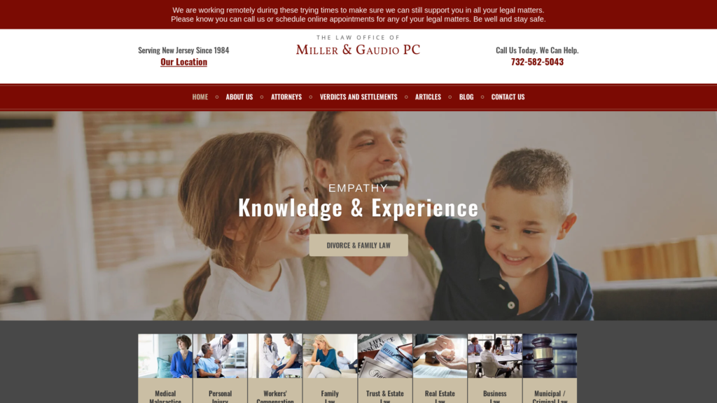 Miller & Gaudio PC, founded in 1984, offers representation in numerous areas of the law, including serious personal injury, family law, divorce, medical malpractice, workers’ compensation, defective products, business litigation, wills and estates, municipal court law, drug offenses, DWI and real estate law.