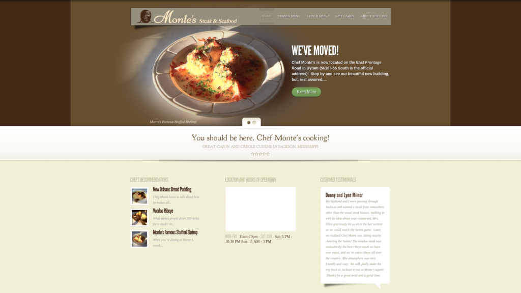 Take a look at the dinner and lunch menus, and you’ll see why you should be here – Chef Monte’s cooking!